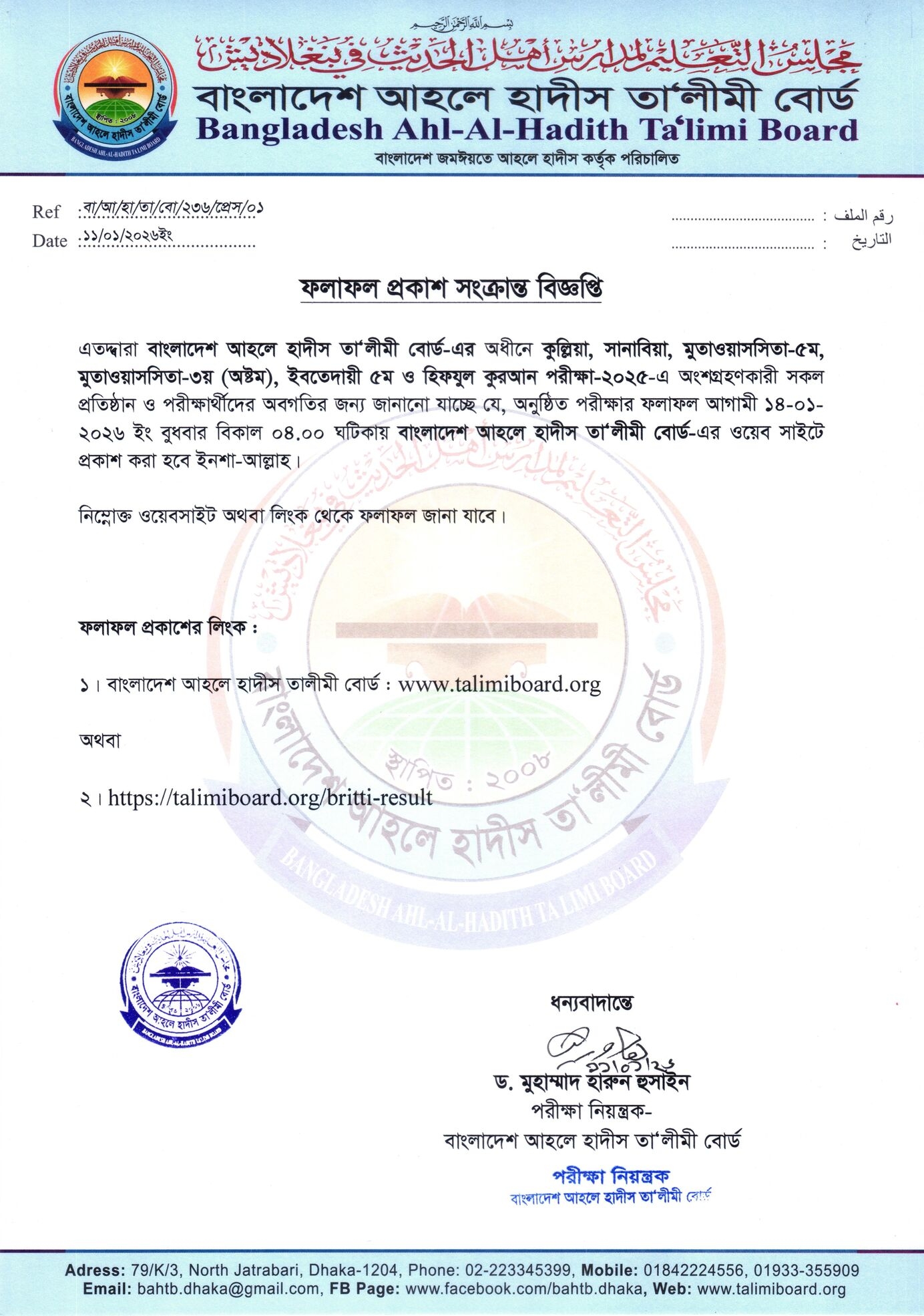 কুল্লিয়া, সানাবিয়া, মুতাওয়াসসিতা ৫ম, মুতাওয়াসসিতা তৃতীয় (৮ম), ইবতেদায়ি ৫ম ও হিফযুল কুরআন পরীক্ষা -২০২৫ এর ফলাফল আগামী ১৪/০১/২০২6 ইং বুধবার বিকাল ৪ ঘটিকায় বাংলাদেশ আহলে হাদীস তা'লীমী বোর্ড- এর ওয়েবসাইটে প্রকাশিত হবে, ইনশাআল্লাহ।