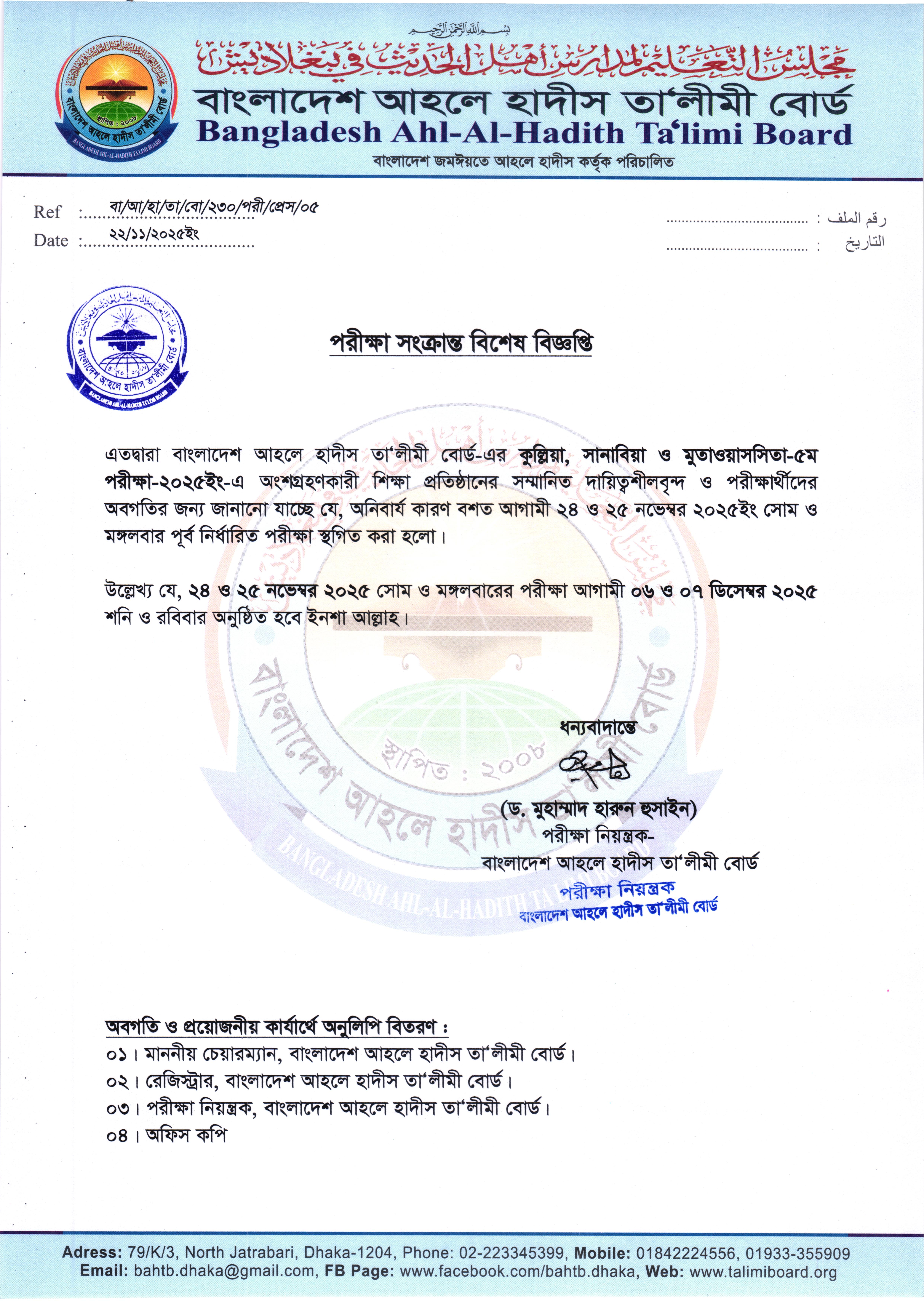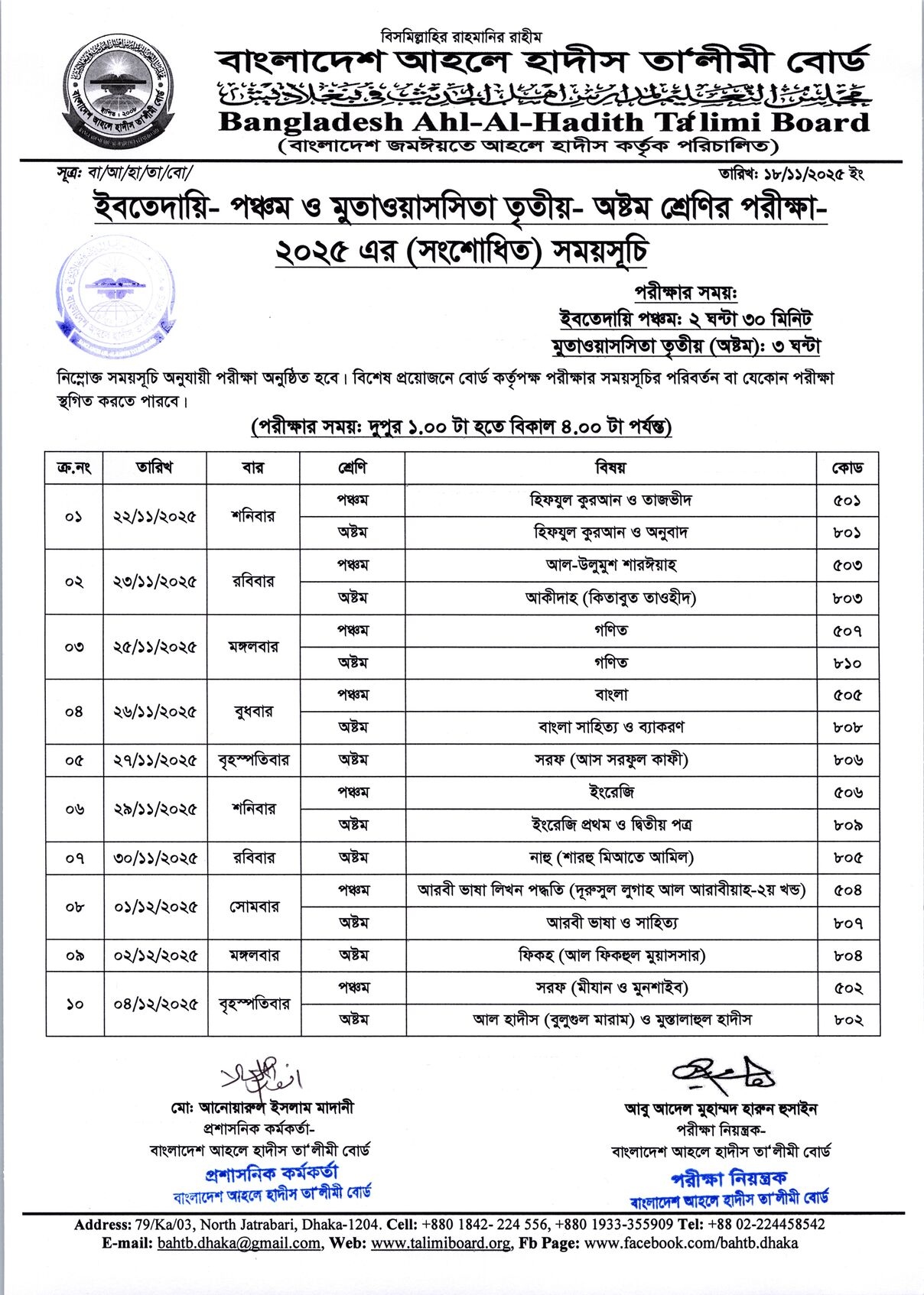 কুল্লিয়া, সানাবিয়া, মুতাওয়াসসিতা, অষ্টম ও পঞ্চম শ্রেণির পরীক্ষার রুটিন-২০২৫